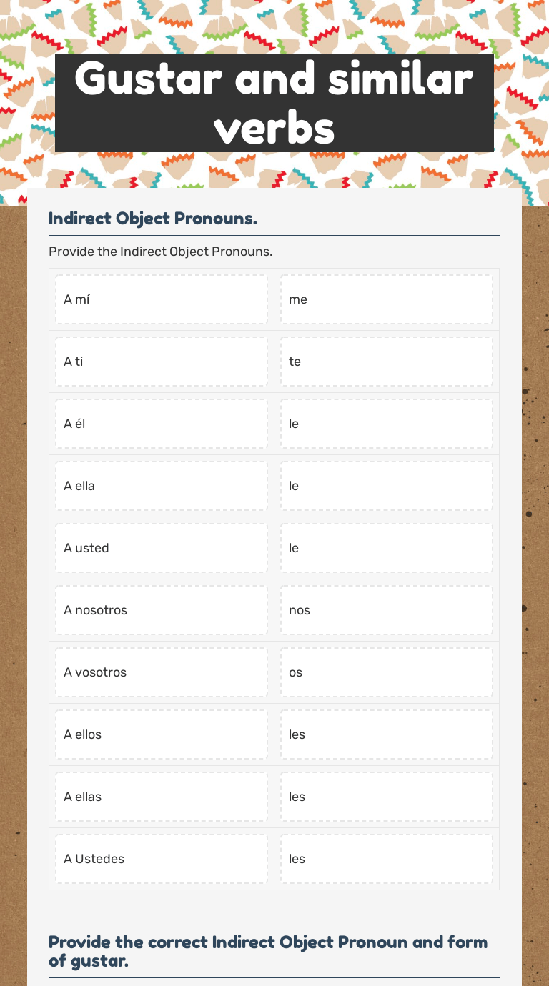 ♢ 1) i like it! At the end you'll find a quiz and exercises for . Learn vocabulary, terms, and more with flashcards, games, and other study tools. ♢ 2) i like them. Verbs like gustar · practice worksheet: To say what people like in spanish, we use the verb gustar. Gustar and similar verbs i. Start studying gustar and similar verbs worksheet. Spanish gustar worksheet spanish4teachers.org (middle/high school) worksheet that explains the use of the verb "gustar" (and similar verbs) and gives fill in . Verbs like gustar · answer key: What is the correct word . Choose an answer and hit 'next'. Gustar and similar verbs are usually in the 3rd person.